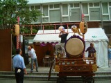仕事を抜け出して、お祭りを見に行く。駅前で太鼓を叩いてたり、お囃子を載せた車が動いてたり、アチコチで露店が出てて、道端で子供がワタアメ食べてたり、あっちこっちでハッピの人が歩いてたり、サンロードでお神輿の群れにまぎれてみたり、東急裏で何連続もお神輿に遭遇したり(遊びに来てて、土地勘無い人は、身動きとれなくなってる可能性あり)で、ウワーたのしーってんで、デジカメでパシャパシャとってたら、スマートメディアが壊れた…いっぱい撮ったのに…